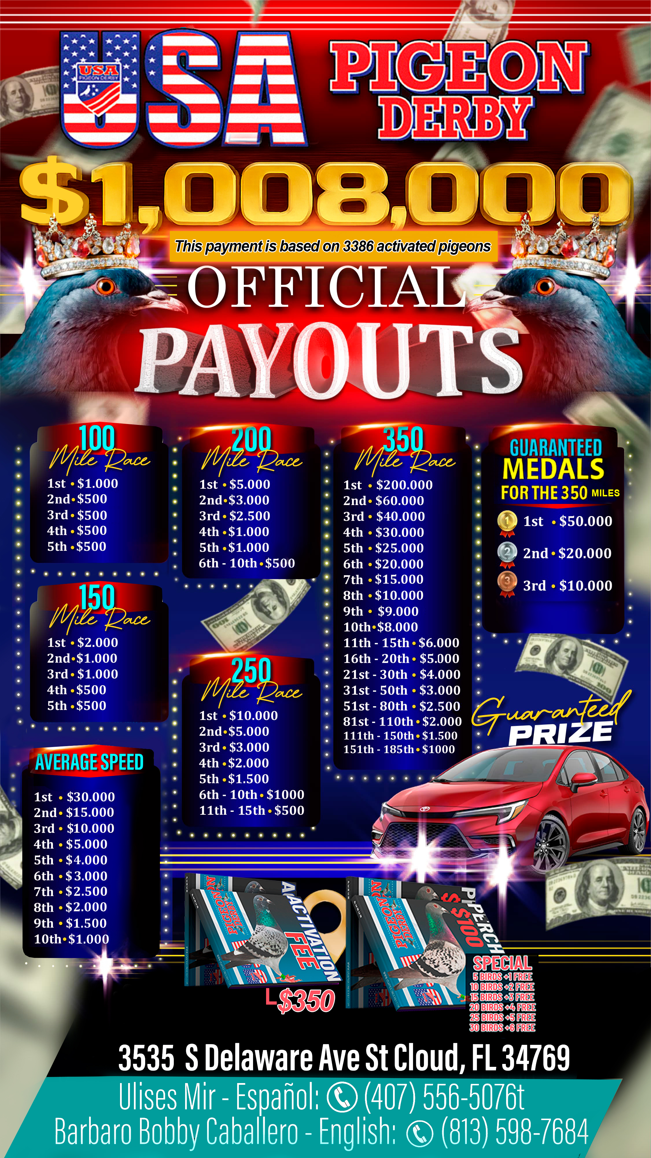 USA PIGEON DERBY is an international one loft race that has motivated many participants to compete with their pigeons as it provides them with good communication and transparency. We also offer you more than 25 years of experience in competitions and obtaining good results as you can find on Facebook as ULISER MIR we thank you for your participation and we will give you a great experience.