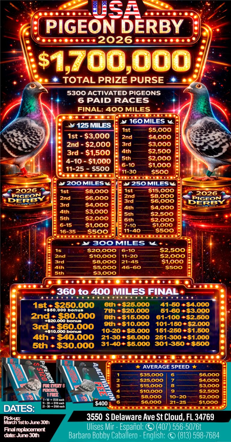 The USA Pigeon Derby is the best one loft race I have ever participated in. The transparency and professionalism are unparalleled, and the results speak for themselves. My pigeons have shown great improvement, and I appreciate the dedication and expertise of Uliser Mir and his team. It’s been a game-changer for my racing pigeons.
